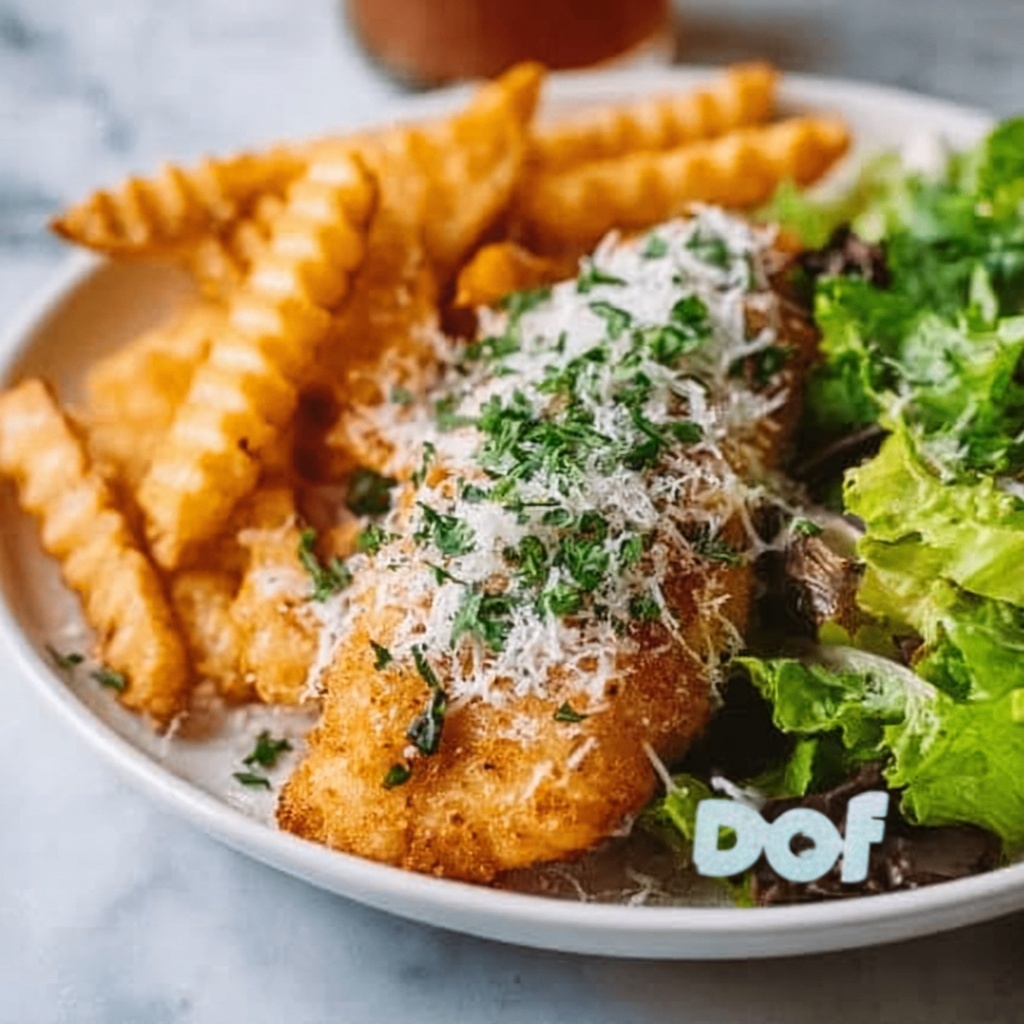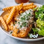 Crispy and flavorful Baked Garlic Parmesan Chicken Tenders, coated in a seasoned panko breadcrumb mixture, baked to golden perfection, and finished with garlic butter and freshly grated parmesan. Served with a tangy dipping sauce, fresh cos lettuce salad, and crispy fries for a complete and satisfying meal.