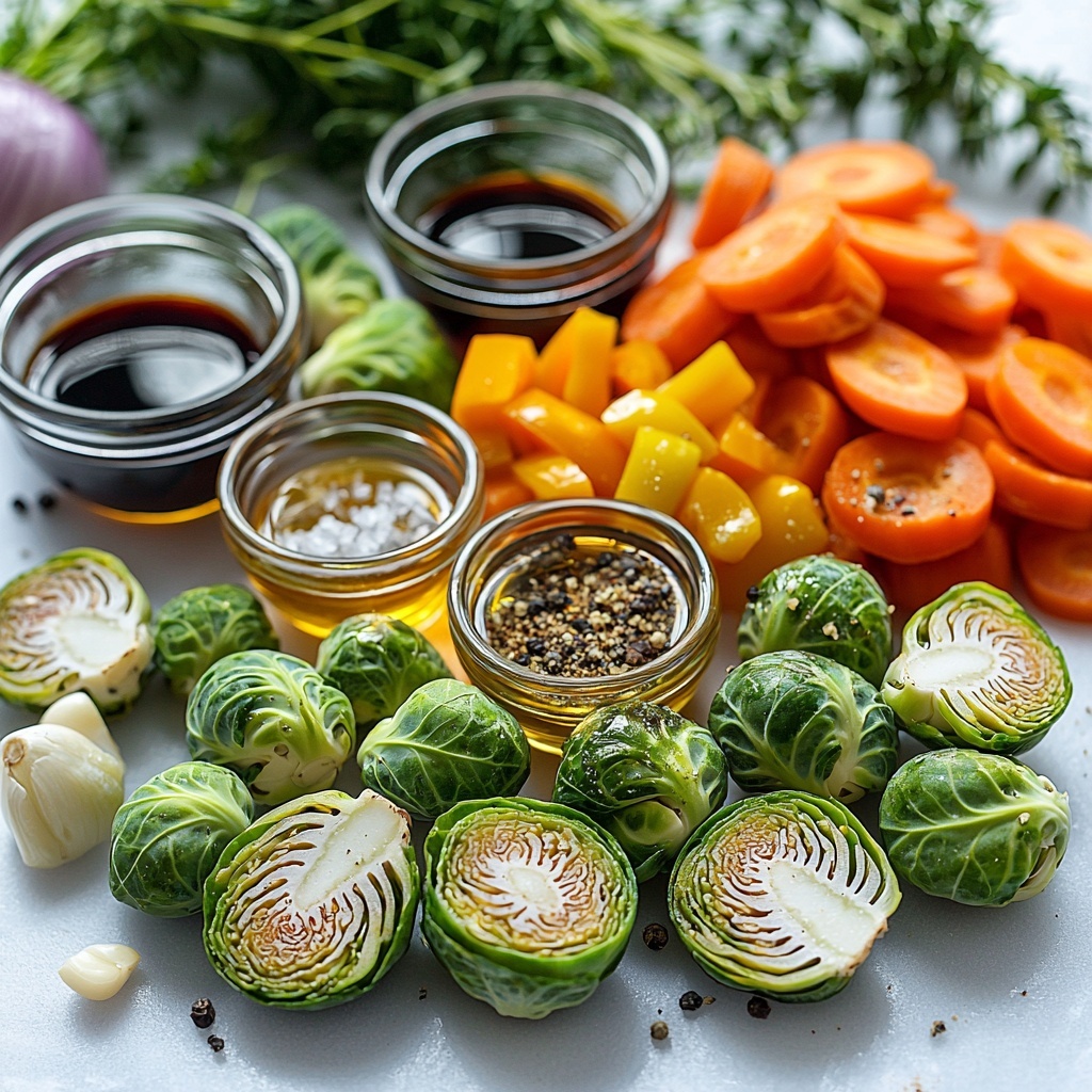 - Prepare Vegetables: In a large bowl, combine the halved Brussels sprouts, sliced carrots, chopped bell peppers, and sliced red onion, making sure they are well mixed for even coating later.