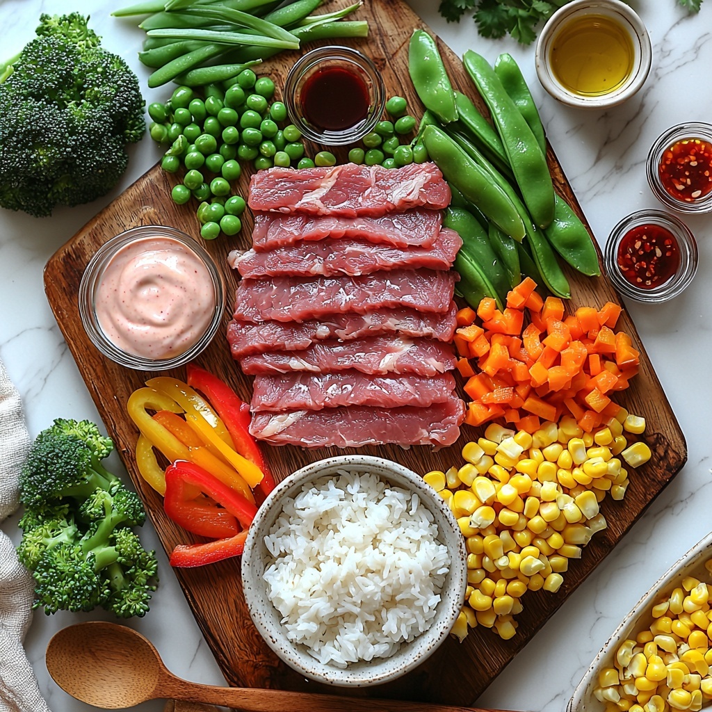 A delicious and vibrant Bang Bang Fried Rice recipe featuring tender beef, colorful vegetables, and a creamy, spicy Bang Bang sauce. Perfect for a quick and satisfying meal, this dish combines day-old jasmine rice with sautéed protein and stir-fried veggies, all coated in a flavorful mayo and sweet chili blend with a kick of sriracha.
