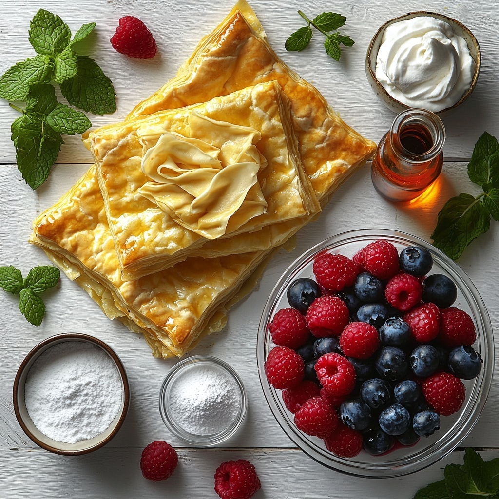 In a clean mixing bowl, whip the heavy cream together with powdered sugar and vanilla extract until stiff peaks form. This luscious cream will add a cloud-like softness that perfectly balances the crisp pastry and juicy berries.