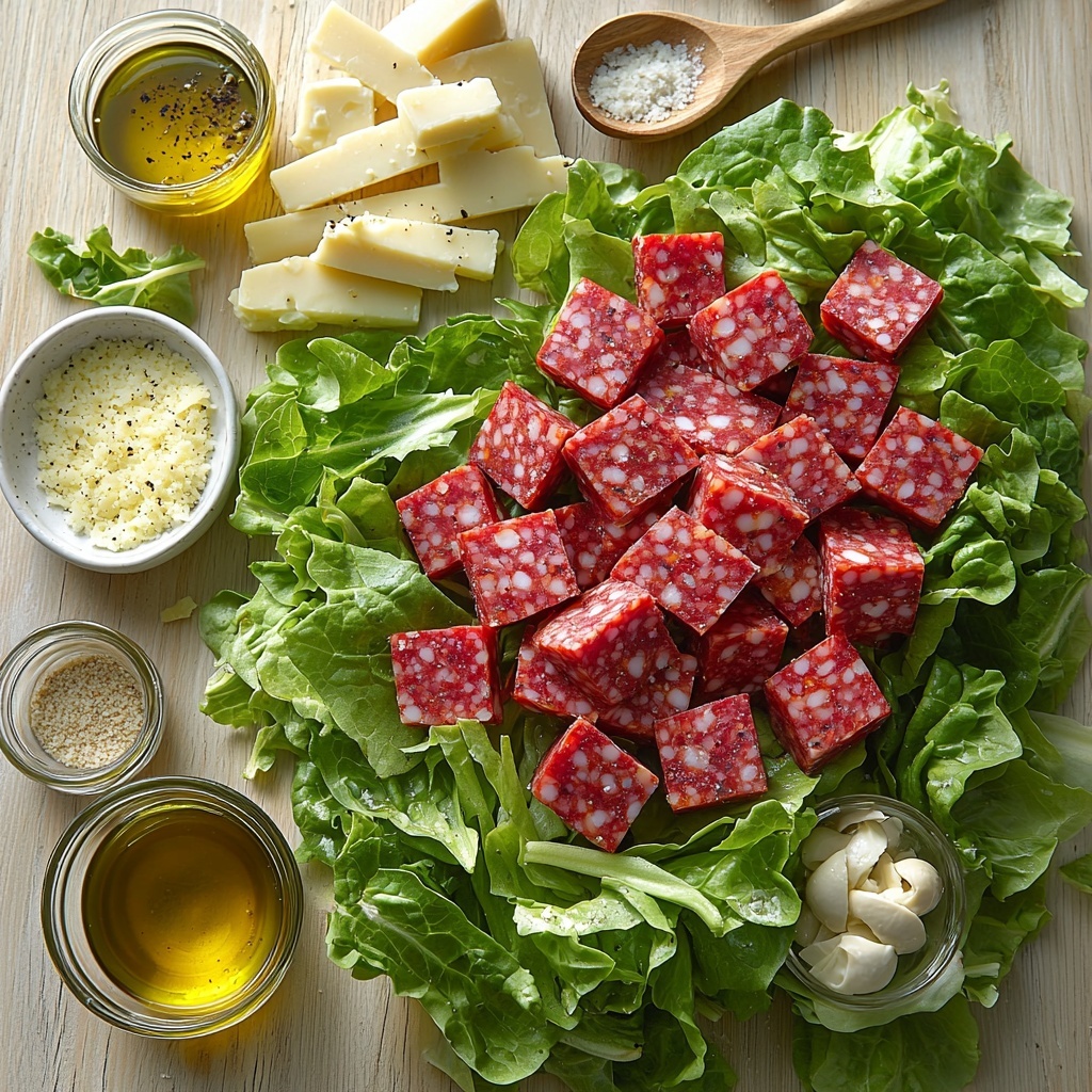 Start by chopping all your fresh ingredients—romaine, salami, cheese, pepperoncini, and red onion—into bite-sized pieces. This prep work sets the stage for easy tossing and ensures every forkful is well-balanced with a little bit of everything.