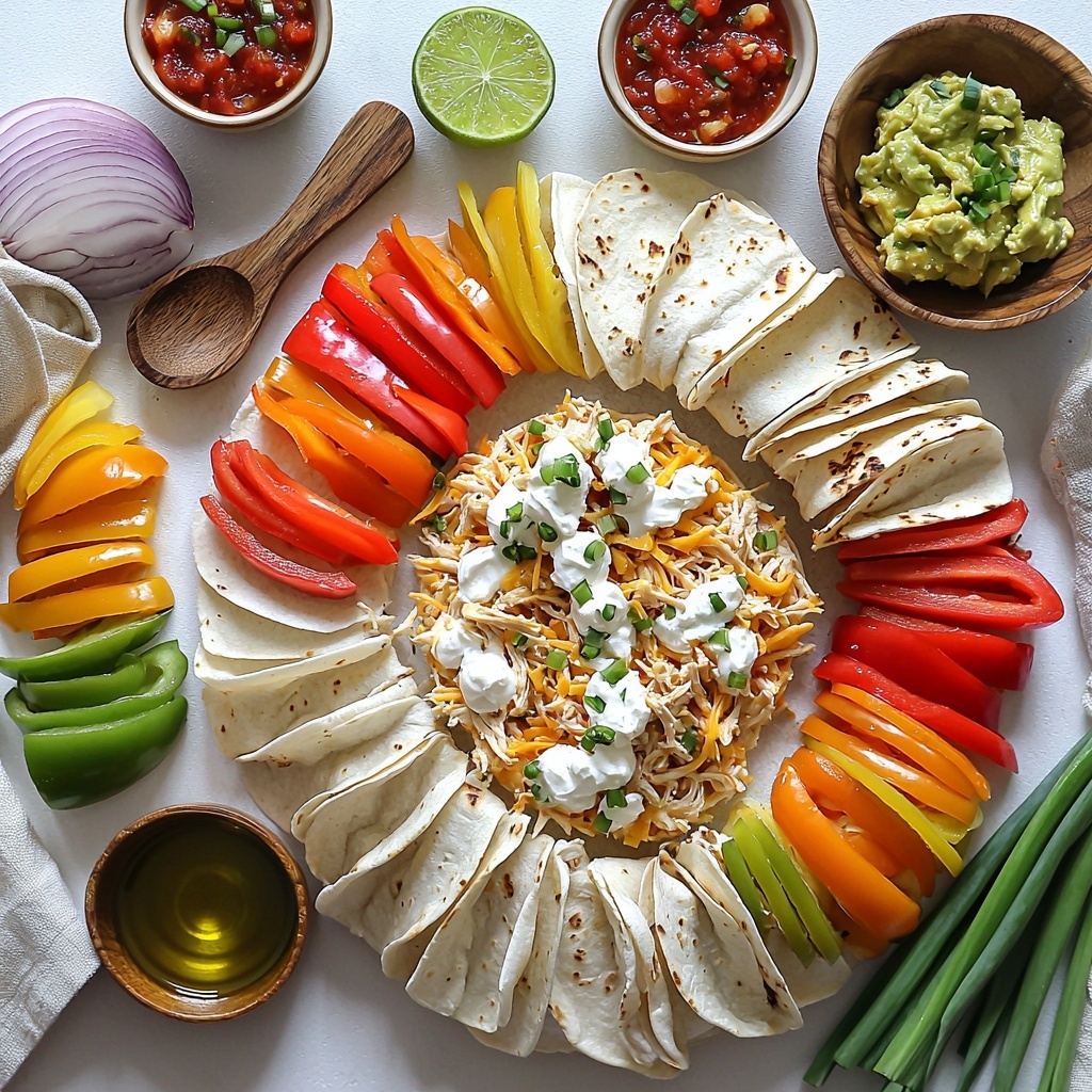 This Blooming Chicken Quesadilla Ring is a fun and flavorful twist on traditional quesadillas, featuring layers of tortillas filled with a creamy, cheesy chicken mixture, vibrant sautéed peppers and onions, and topped with melted cheddar and mozzarella cheese. Baked to crispy perfection, it serves as a perfect shareable appetizer or party dish, accompanied by salsa, guacamole, and sour cream for dipping.