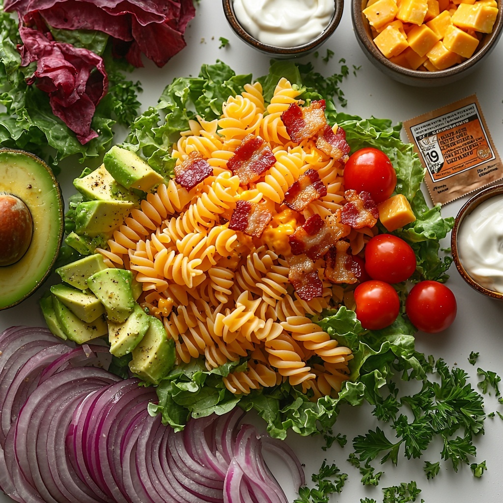 A fresh and flavorful BLT Pasta Salad combining crunchy bacon, creamy avocado, tangy cherry tomatoes, sharp cheddar cheese, and crisp romaine lettuce, all tossed in a zesty Hidden Valley ranch dressing. Perfect for potlucks, picnics, or a hearty side dish that takes only 40 minutes to prepare.