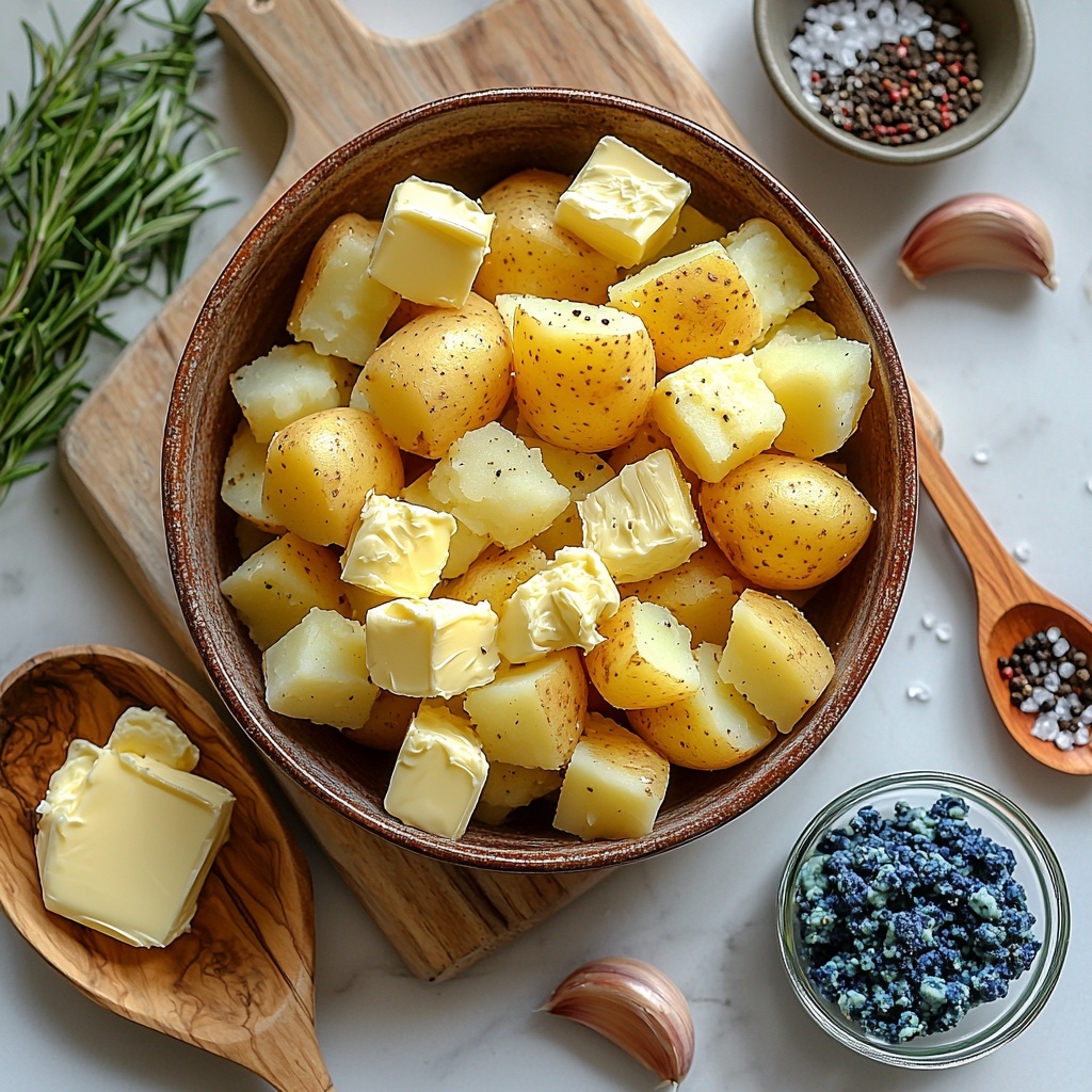- Mash Potatoes: Drain the cooked potatoes thoroughly and return them to the pot placed over low heat. Use an electric hand mixer to mash the potatoes until smooth, then fold in the garlic-rosemary butter and half of the blue cheese crumbles by hand to integrate evenly.