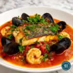 This recipe focuses on seafood, which is traditional, but for a vegan twist, you can replace the fish stock with vegetable broth and include hearty vegetables like fennel, potatoes, and artichokes along with plant-based seafood alternatives.