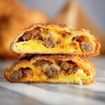 The key is to make sure your sausage is well cooked and drained and the eggs are soft but not runny. Also, leaving a border of dough without filling helps the roll stay sealed and prevents leaking. Baking at the right temperature ensures the crust crisps nicely.