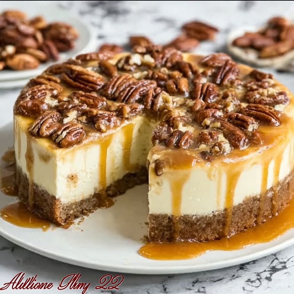 This rich and creamy Butter Pecan Cheesecake features a buttery graham cracker crust studded with toasted pecans, topped with a luscious cream cheese filling mixed with browned sugar and buttered pecans. Finished with a caramel drizzle and extra pecans, this classic dessert is perfect for special occasions or indulgent treats.