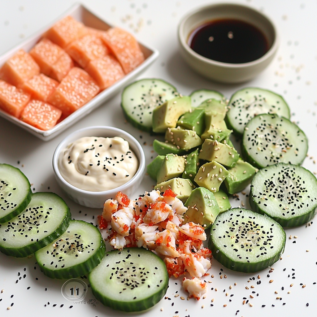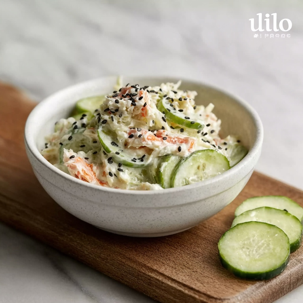 - Combine ingredients: In a larger salad bowl, gently mix the sliced cucumber, chopped imitation crab, and cubed avocado together.