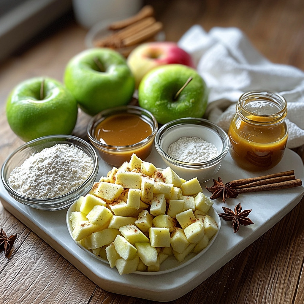 Gathering these simple, familiar ingredients is the first step to creating a truly irresistible dessert. Each component plays an essential role, from the crunchy crumbly crust to the sweet, spiced apple filling and the final touch of caramel that ties it all together.