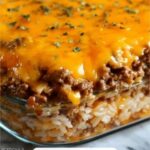 This Cheddar-Crusted Ground Beef and Rice Casserole is a hearty and comforting dish perfect for a family dinner. Featuring seasoned ground beef, fluffy rice, and a rich cheesy crust, this casserole combines savory flavors with a creamy texture. Baked to golden perfection, it’s easy to prepare and ideal for a satisfying meal that everyone will love.