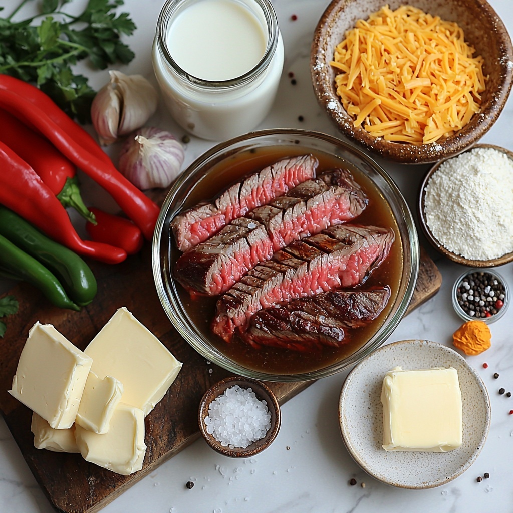Turn the heat to high and add the remaining tablespoon of olive oil. Season your thinly sliced ribeye or sirloin generously with salt, pepper, garlic powder, onion powder, and smoked paprika for that cozy smoky undertone. Sear the steak for 2–3 minutes on each side until it develops a beautiful crust but remains juicy inside. Just before removing it from the heat, stir in the minced garlic and Worcestershire sauce, cooking for another 1–2 minutes to deepen the flavor even further. Let the steak rest while you prepare the cheese sauce.