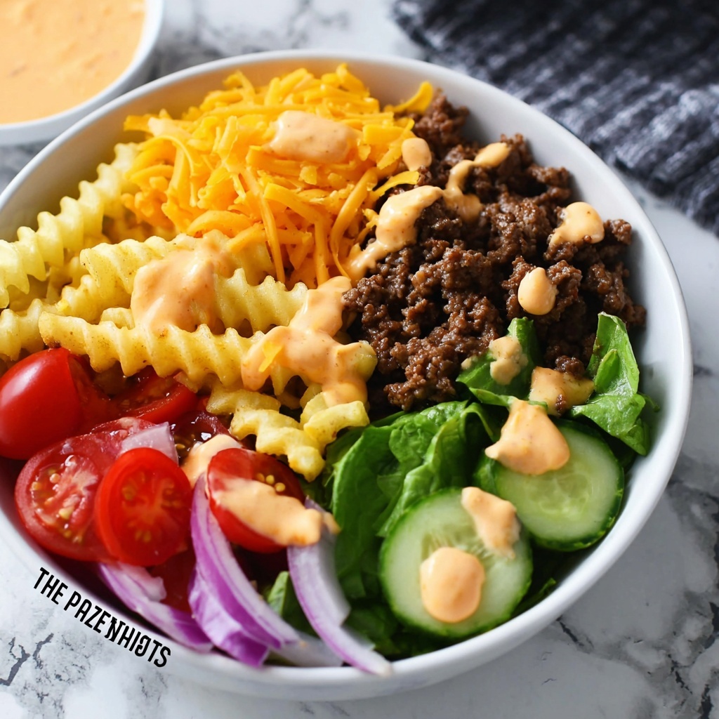 Now the fun begins—assembling your cheeseburger bowls! Divide the cooked beef and onions evenly among four bowls. Layer in chopped romaine lettuce for freshness, freshly grated cheddar for that melty cheeseburger experience, cherry tomatoes for a juicy pop, and slices of dill pickles that provide the right amount of tang. Don’t forget to drizzle your chilled Big Mac sauce generously over the top. Each forkful will be packed with the layers of flavors and textures you love from a classic Big Mac—without the bun.