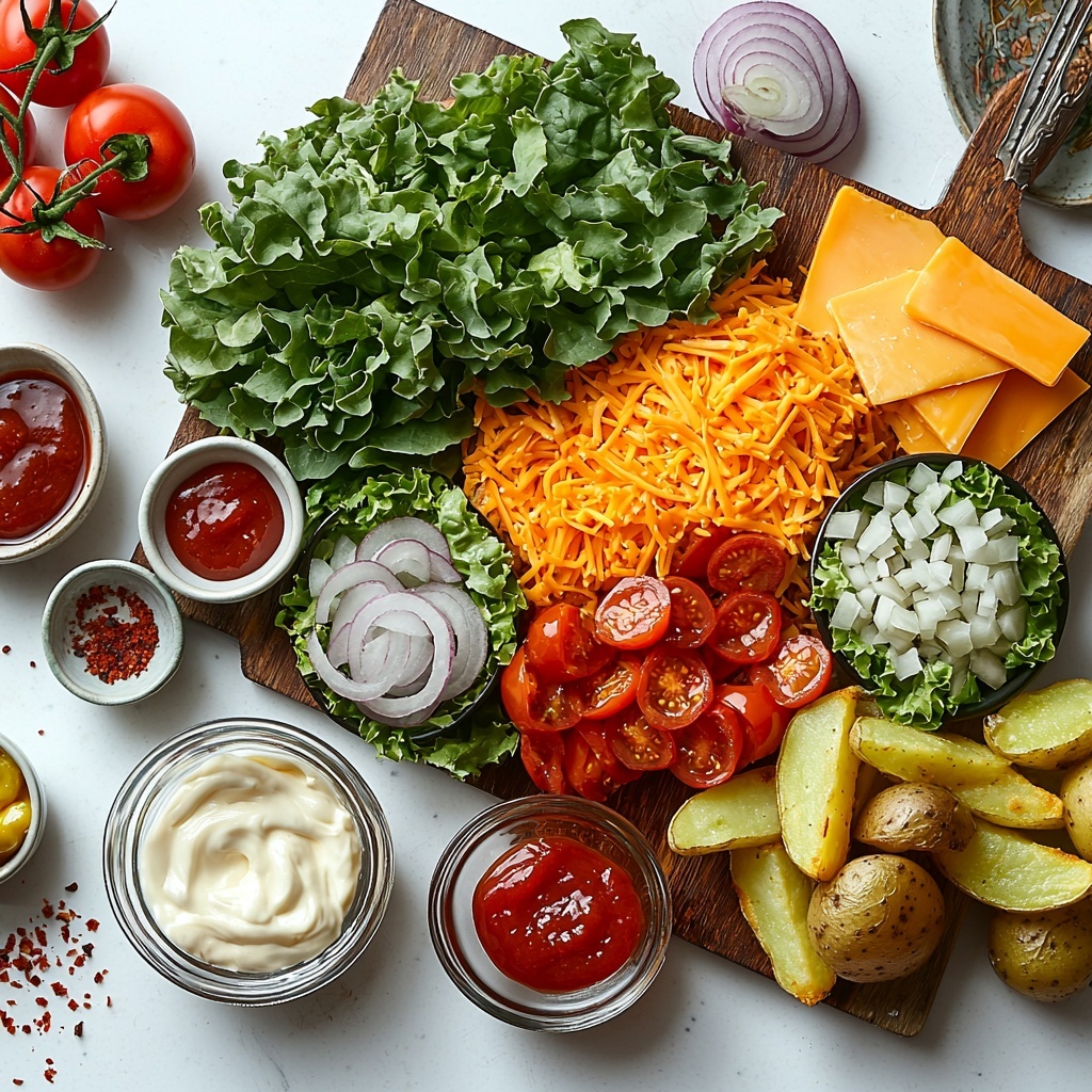 - Assemble the Cheeseburger Bowls: Divide the seasoned ground beef evenly among four medium-sized bowls. Add chopped romaine lettuce, a generous sprinkle of cheddar cheese, sliced cherry tomatoes, dill pickles, cooked potato wedges or French fries, and sliced red onion if using.