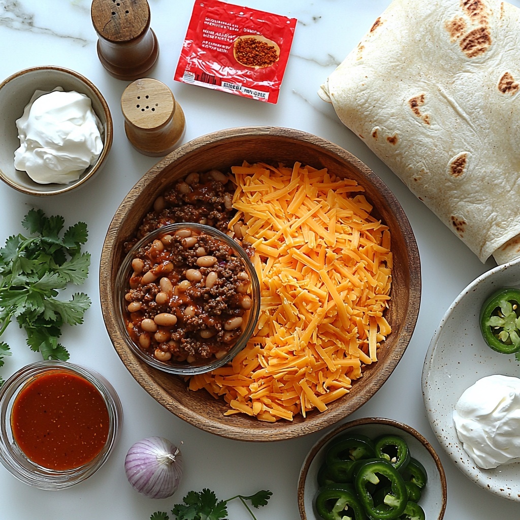 Start by heating olive oil in a large skillet over medium-high heat. Toss in the diced onion and sauté for about 2 to 3 minutes until it softens and becomes translucent, filling your kitchen with a subtle sweetness. Next, add the minced garlic along with the ground beef. Break the beef apart with your spoon and cook for about 5 to 7 minutes until the meat is nicely browned and cooked through, releasing those irresistible savory aromas. Stir in the taco seasoning, refried beans, and season with salt and pepper. Let everything cook together for another 2 to 3 minutes so the flavors meld into a savory, rich filling. Once it’s beautifully combined, remove the skillet from heat so your filling can rest just a bit.