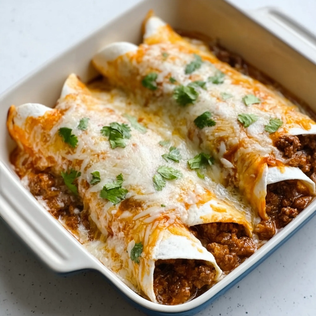 Preheat your oven to 375°F (190°C) and lightly grease a 9×13-inch baking dish. To create the perfect base, spread about 1/4 cup of enchilada sauce evenly across the bottom of the dish. Lay one flour tortilla flat, spoon approximately 1/4 cup of the beef and bean mixture into the center, then tightly roll it up. Place each rolled tortilla seam-side down in the baking dish, arranging them neatly side-by-side. Repeat this process until all eight tortillas are filled and snug in the dish. Next, pour the remaining enchilada sauce generously on top, making sure each roll gets coated and ready to soak up that irresistible flavor.