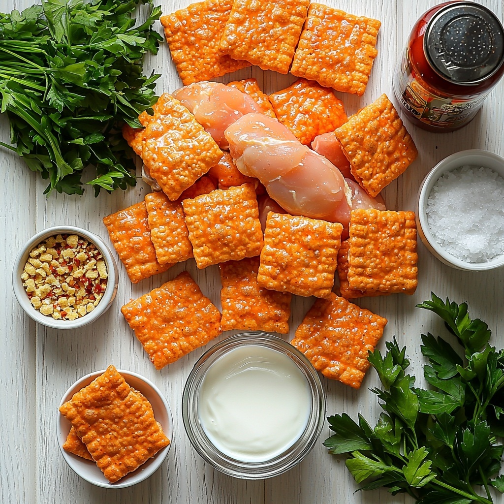 These ingredients are straightforward but carefully chosen to create layers of flavor and texture. Each one plays a crucial role, from the tangy buttermilk marinade tenderizing the chicken to the zesty spices and the crunchy Cheez-It crumbs that make every bite a delight.