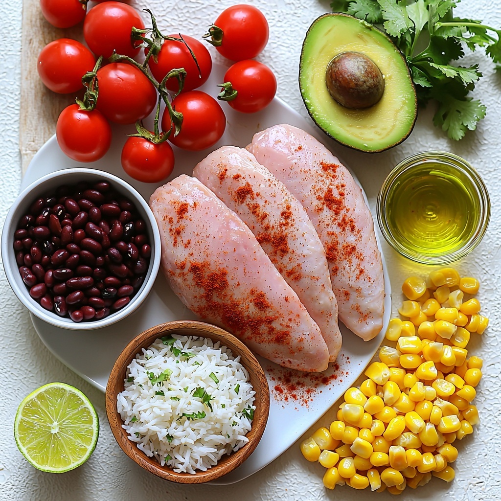 The magic of this Chicken Burrito Bowl with Black Beans, Corn, and Avocado Recipe lies in its simple, fresh ingredients. Each element brings something special, whether it’s the spice that livens up the chicken or the creamy avocado that cools it down. Here’s what you’ll gather to create this mouthwatering meal.