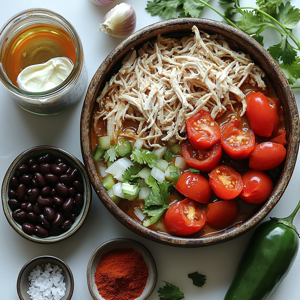 - Combine main ingredients: Gently add shredded chicken, black beans, fire-roasted tomatoes, and chicken broth to the pot. Sprinkle in cumin, chili powder, salt, and pepper, then stir thoroughly to combine all the flavors.