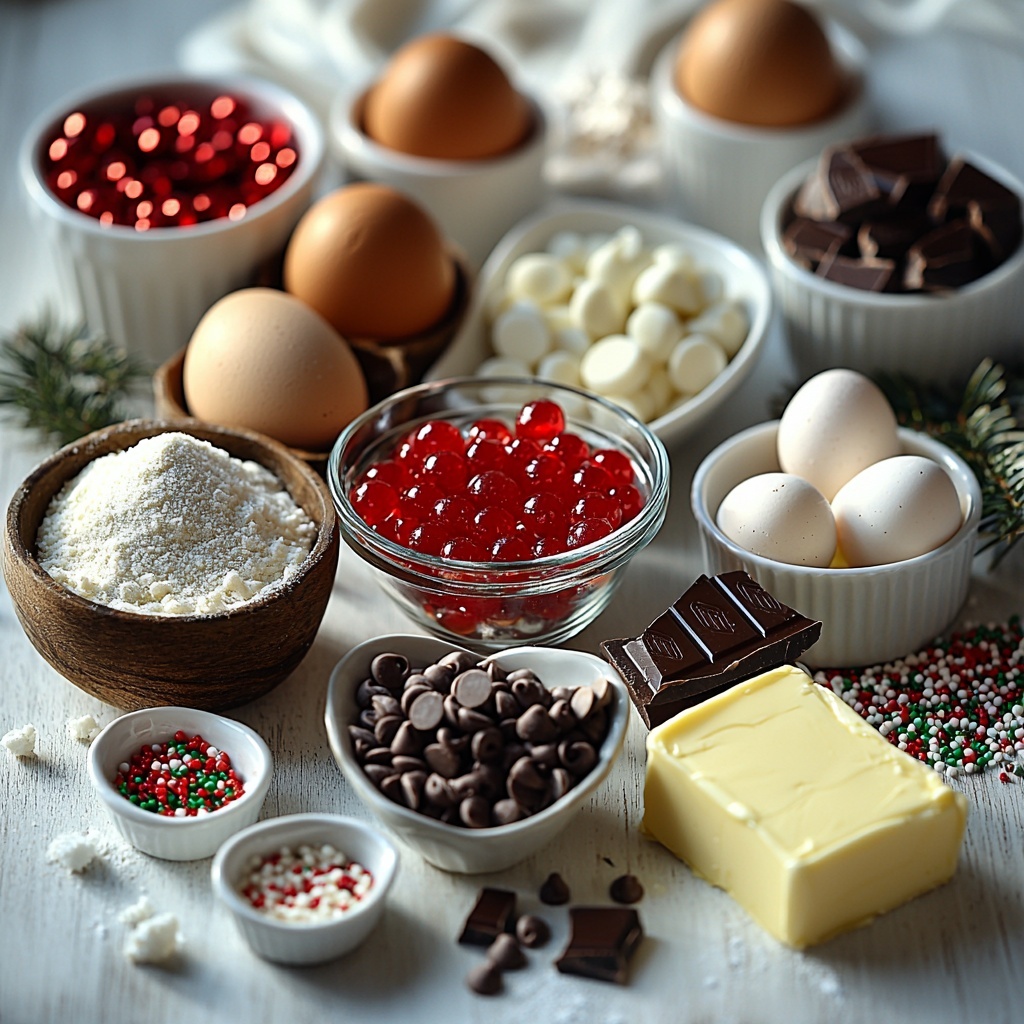 The magic of this Christmas Cookie Bars Recipe lies in its straightforward ingredients that each play a crucial role, from adding rich buttery depth to packing festive colors and delightful textures. Here’s what you’ll need to create these delicious bars:
