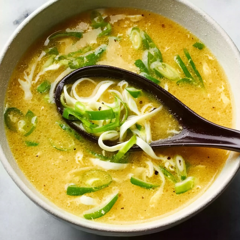 Classic Egg Drop Soup is a simple and comforting Chinese appetizer made by gently swirling beaten eggs into hot chicken broth, creating delicate egg ribbons. Enhanced with white pepper, sesame oil, and thickened slightly with cornstarch, this quick 15-minute soup is garnished with fresh green onions, offering a flavorful, warming start to any meal.