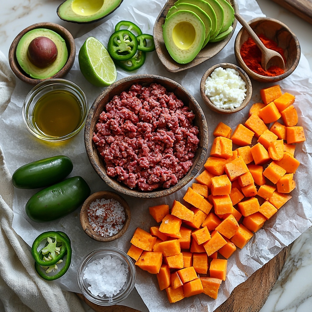 The magic of the Cottage Cheese Ground Beef and Sweet Potato Bowls Recipe lies in its simple, wholesome ingredients that are easy to find and deliver bold flavor and satisfying texture. Each component plays a vital role—from the smoky spices that elevate the beef and sweet potatoes to the creamy cottage cheese and fresh toppings that add brightness and contrast.