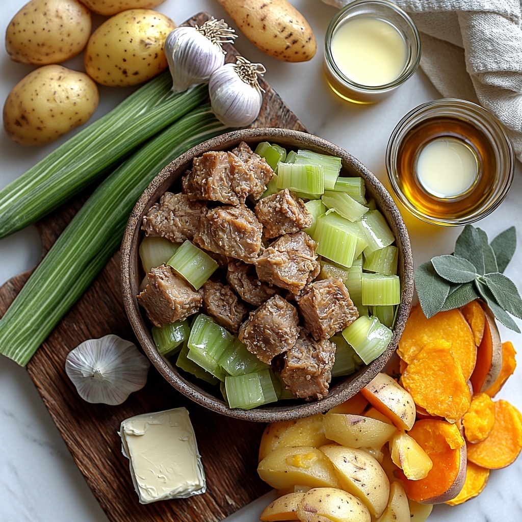 Though the ingredients for this Cozy Slow-Cooked Pork, Cider & Sage Hotpot Recipe are straightforward, each one plays an essential role in building layers of flavor, texture, and color. From the tender pork shoulder to the creamy topping and aromatic herbs, every element carefully complements the others.