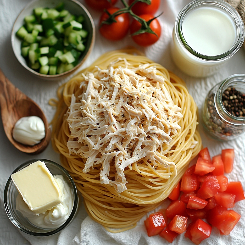 The magic behind this Creamy Chicken Spaghetti Recipe lies in its simple yet thoughtfully chosen ingredients. Each one plays a crucial role in building layers of flavor and texture, from the tender shredded chicken that brings savory depth to the dish, to the creamy sauce components that ensure every bite is rich and inviting.