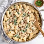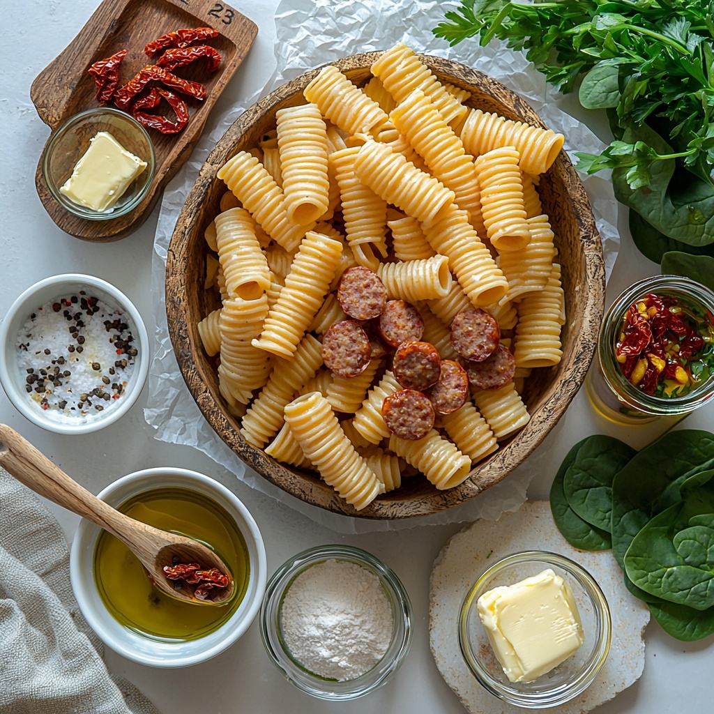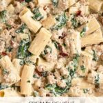 This creamy Italian sausage pasta features perfectly cooked rigatoni tossed in a rich and velvety sauce made with a blend of Italian sausage, sun-dried tomatoes, and parmesan cheese. The sauce is thickened with a butter and flour roux and enriched with heavy cream and chicken broth, then finished with fresh baby spinach for a touch of brightness. Ready in just 30 minutes, this comforting dish is perfect for an easy weeknight dinner or casual gathering.