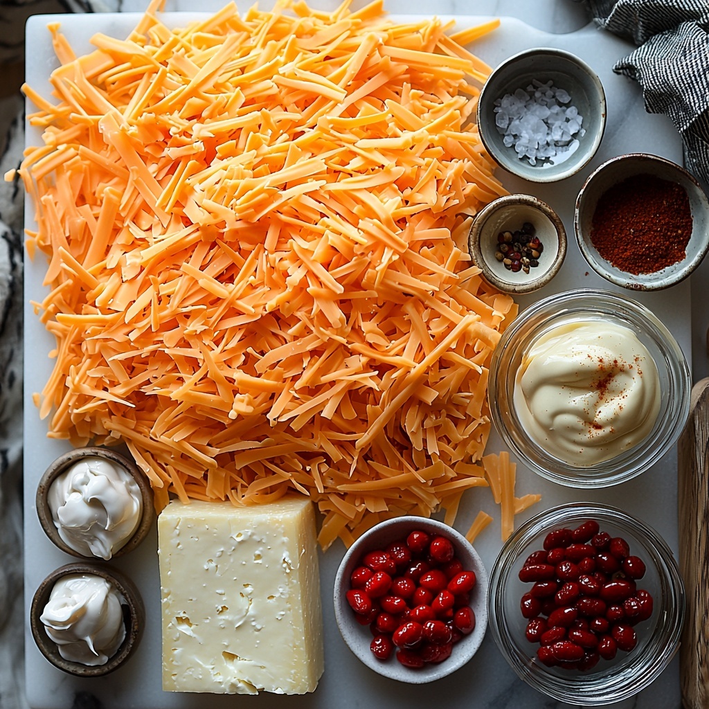 Gathering the right ingredients is key to nailing that perfect creamy, flavorful profile in this pimento cheese spread. Each element plays an essential role, from the sharpness of the cheddar to the subtle kick from cayenne pepper, all combining for an unforgettable taste and spreadable texture.