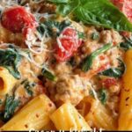 This creamy sausage rigatoni recipe combines Italian sausage, fresh spinach, garlic, and cherry tomatoes in a rich tomato cream sauce. Perfectly cooked rigatoni pasta is tossed in a flavorful blend of heavy cream, chicken broth, and Parmesan cheese, resulting in a comforting and indulgent meal ready in just 45 minutes.