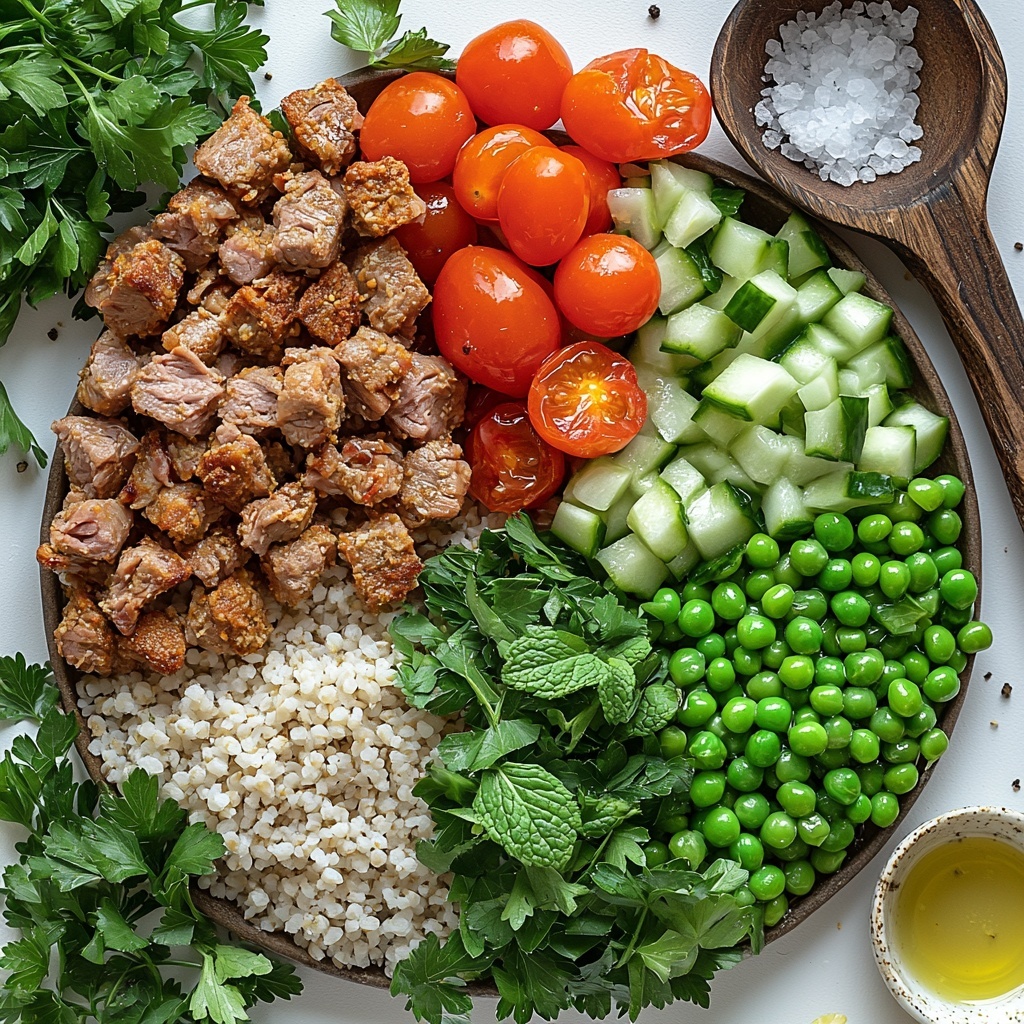 - Prepare tabbouleh mix: In a large bowl, combine the soaked bulgur with thawed peas, diced cherry tomatoes, finely chopped cucumber, parsley, mint, and green onions, mixing well to integrate all fresh ingredients.