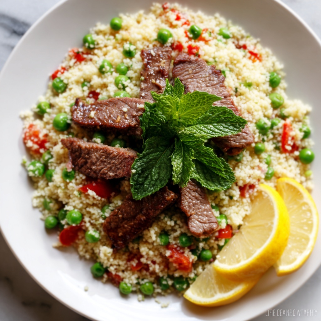 - Assemble and serve: Top the dressed tabbouleh with the crispy lamb pieces and serve immediately, optionally accompanied by lemon wedges for extra zest.