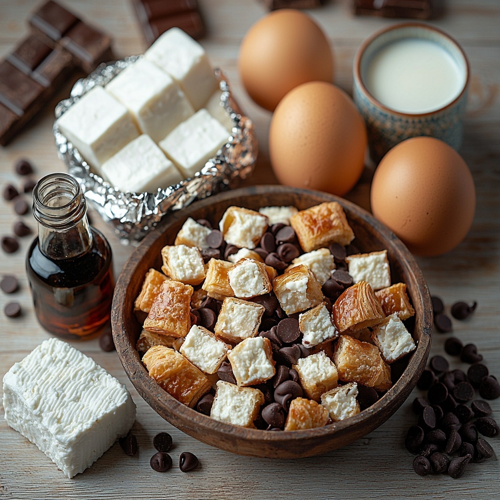 Gathering simple, wholesome ingredients will make this Croissant Breakfast Bake with Chocolate Chips and Cream Cheese Recipe shine. Each component plays a key role: from the flaky croissants that create a tender base, to the cream cheese adding velvety richness, and the chocolate chips delivering those irresistible pockets of melty sweetness.