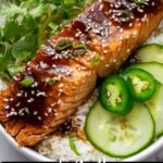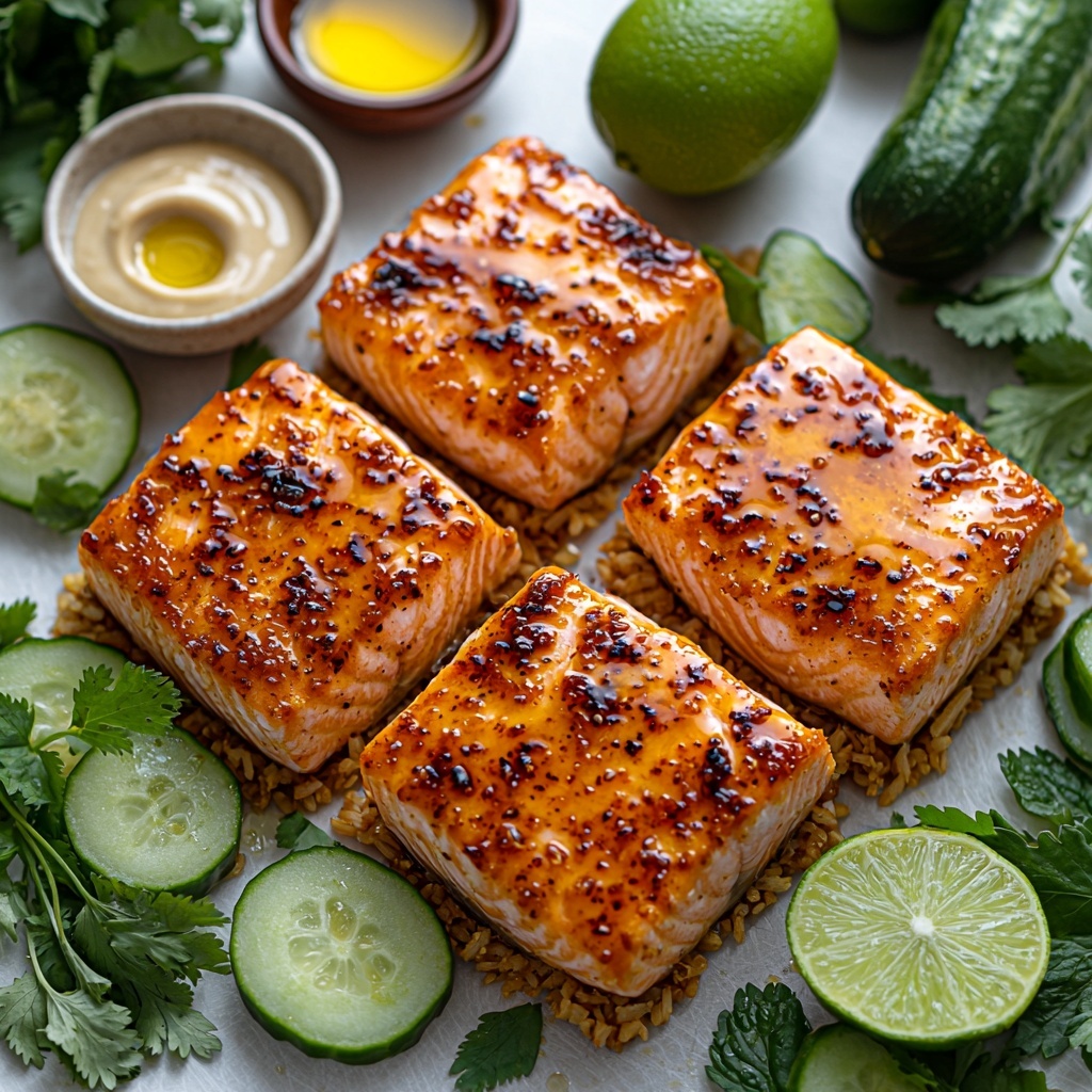 These Crunchy Brown Rice Salmon Bowls feature tender broiled salmon glazed with a honey-soy-lime mixture, paired with crispy pan-fried brown rice and fresh cucumber slices. Finished with a creamy herbed tahini dressing, this balanced dish combines vibrant flavors and textures for a wholesome and delicious meal.