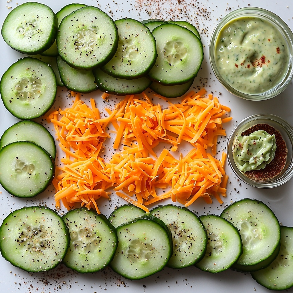 A quick and easy cucumber snack featuring fresh cucumber slices topped with shredded cheese, savory turkey, and a blend of flavorful seasonings, all brought together with a creamy avocado lime ranch dressing. Perfect for a light, satisfying snack or appetizer in just 5 minutes.