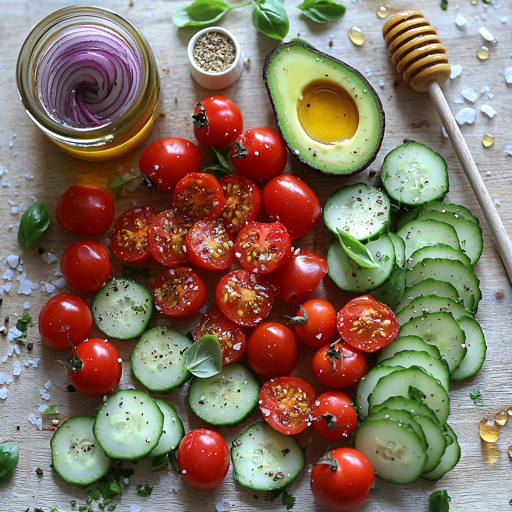 - Combine salad ingredients: Add the thinly sliced cucumber, halved cherry tomatoes, cubed avocado, finely chopped red onion, and chopped fresh herbs to a large serving bowl.
