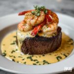 Indulge in this luxurious Decadent Filet Mignon with Shrimp and Lobster Cream Sauce, a perfect dish for special occasions. Tender filet mignon steaks are perfectly seared and topped with a rich, creamy sauce featuring succulent shrimp and lobster meat, finished with fresh parsley for a burst of color and flavor.