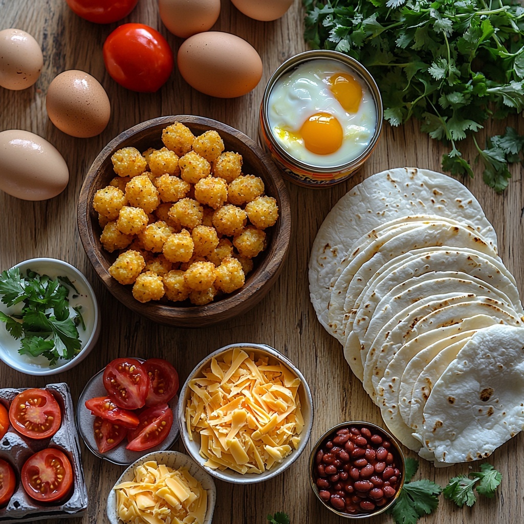 Lay each tortilla flat and spread a good spoonful of refried beans down the center. Layer on the crispy tater tots, cooked sausage, creamy eggs, a generous sprinkling of shredded cheddar and Monterey Jack cheeses, diced Roma tomatoes for a juicy punch, and a scattering of fresh cilantro leaves. Each ingredient brings a wonderful balance—just like a morning hug on a plate.