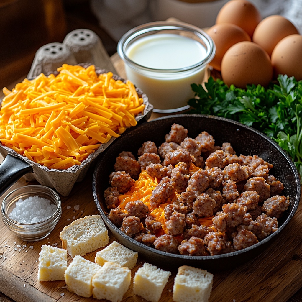 Next, scatter the cooked sausage evenly over the bread cubes. Follow that with a generous sprinkling of shredded cheddar cheese. This layering ensures every forkful gives you the right balance of meaty, cheesy goodness paired with soft, custardy bread.