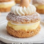 These Delightful Mini Egg Cream Puffs are the perfect festive treat for your Easter celebration. Featuring a crisp craquelin topping over light and airy choux pastry shells, filled with decadent dark chocolate pastry cream and topped with fluffy white chocolate whipped cream, these cream puffs are garnished with whimsical chocolate mini eggs and a hint of ground hazelnut flour for an extra nutty touch.