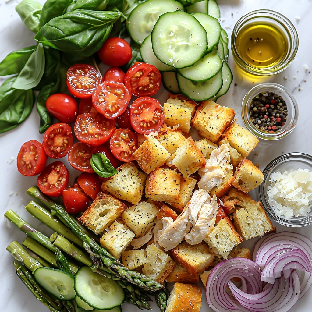 - Combine salad components: In a large mixing bowl, combine the cooked chicken, toasted bread cubes, cherry tomatoes, cucumber, blanched asparagus, red onion, torn basil leaves, and chopped parsley. Toss gently to mix all ingredients evenly.