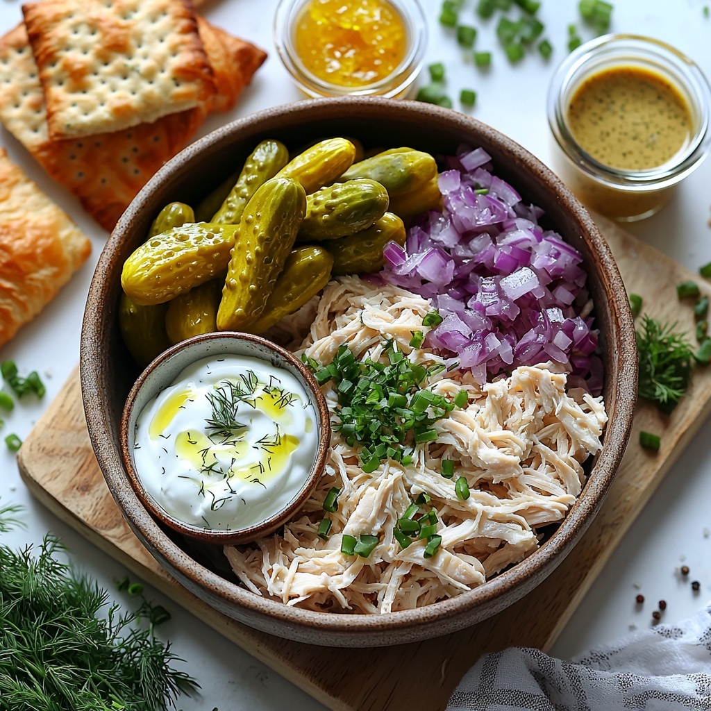 Start by shredding your cooked chicken into bite-sized pieces—this makes every forkful feel like a crunchy, creamy delight. Then chop up the dill pickles and dice the red onions; their contrasting textures and flavors are essential for that classic zingy chicken salad taste you’re after.