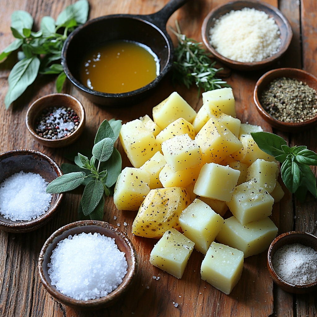 This recipe keeps things wonderfully simple, using staples that highlight the natural goodness of potatoes while incorporating rich, aromatic accents. Each ingredient plays a vital role in building the final heavenly texture and flavor—whether it’s the duck fat providing that unparalleled crispiness or the baking soda creating more surface area for crunch. Fresh herbs add those final bursts of color and freshness that truly elevate the dish.