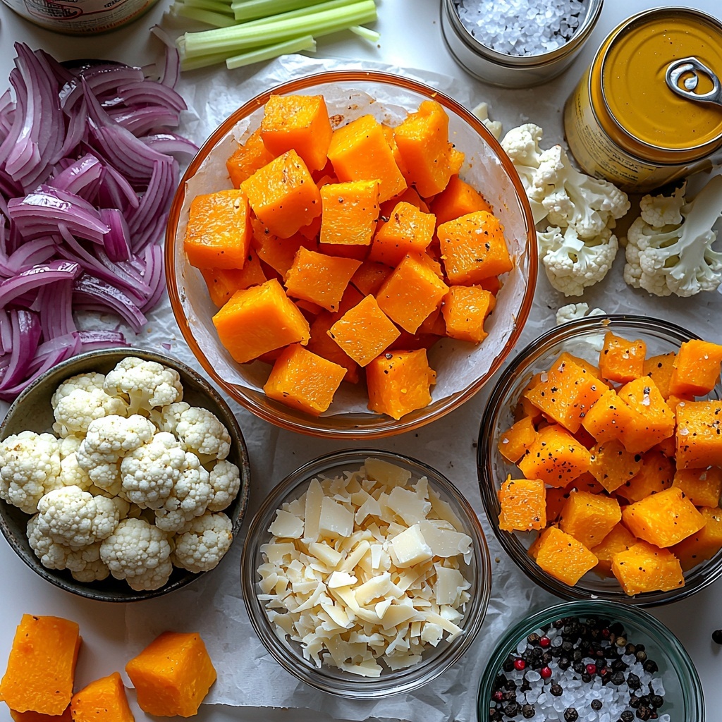 Begin by washing and cutting the butternut squash into bite-sized cubes and breaking the cauliflower into small florets. Dice the red onions finely to ensure they blend seamlessly into the casserole. These preps might take a few minutes, but they set the foundation for the dish’s lovely texture.