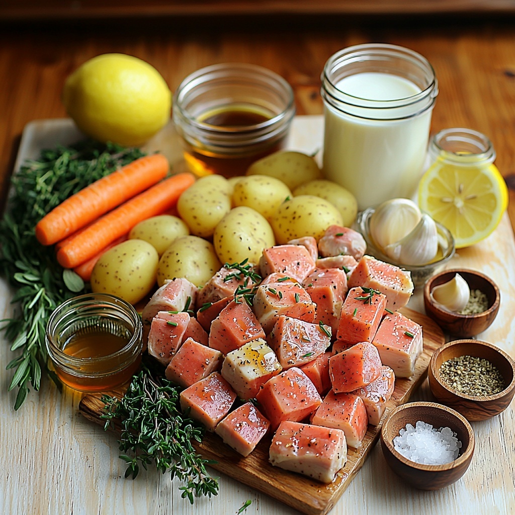 Starting off, peel your potatoes and chop them into roughly 1-inch cubes to ensure they cook evenly. Place them in a pot filled with cold water, salted generously to season them from the start. Peel and slice your carrots into uniform rounds or diagonal pieces about 1/4-inch thick for quick, even cooking. Now for the star protein: pat your chicken breasts or thighs completely dry — this is crucial for a golden sear — then season both sides with salt, freshly ground black pepper, minced garlic, and freshly chopped herbs. Press the herbs gently into the chicken so all those wonderful flavors stick and infuse beautifully during cooking.