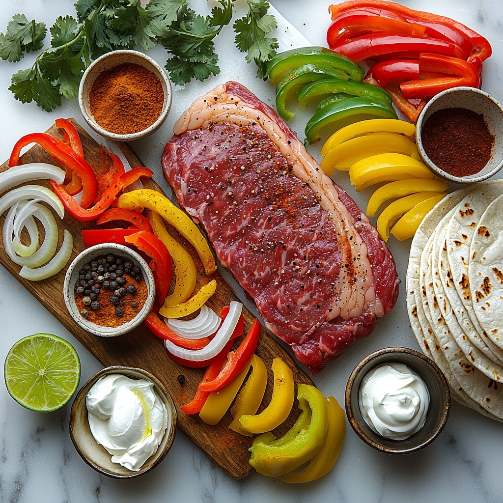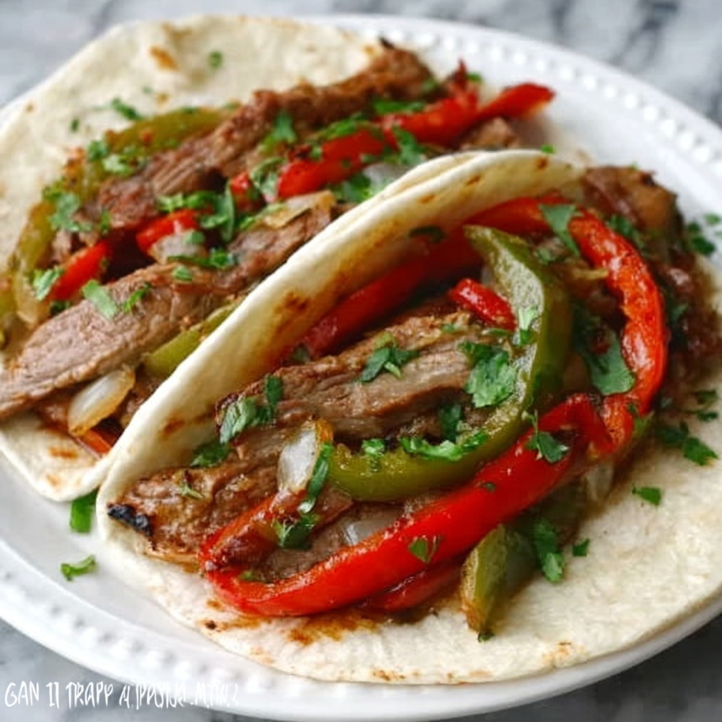 This Steak Fajitas recipe features tender flank steak marinated in a flavorful blend of spices, seared to perfection, and served with sautéed bell peppers and onions. Wrapped in warm flour tortillas and garnished with fresh cilantro and optional sour cream, these fajitas make for a quick, vibrant, and satisfying Mexican-inspired meal perfect for any weeknight dinner.