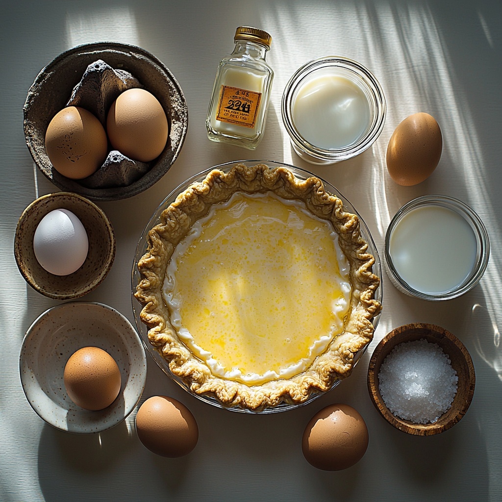 To whip up this luscious Egg Custard Pie Recipe, you only need a handful of straightforward ingredients that come together beautifully. Each one plays a crucial role in creating the pie’s velvety texture, sweet balance, and delightful aroma.