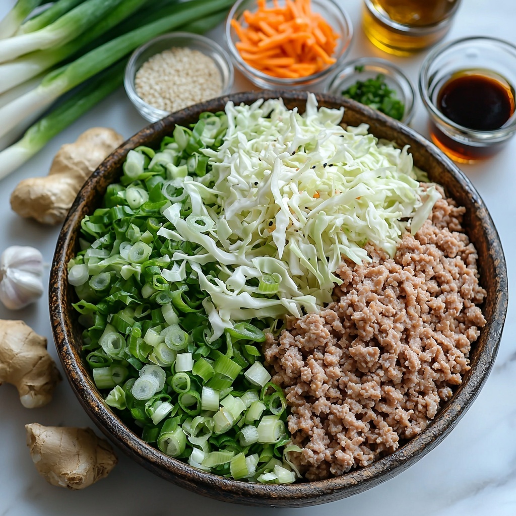 - Prepare your ingredients: Chop the green onions, mince the garlic and fresh ginger, grate the carrots, and shred the green cabbage so everything is ready for quick cooking.