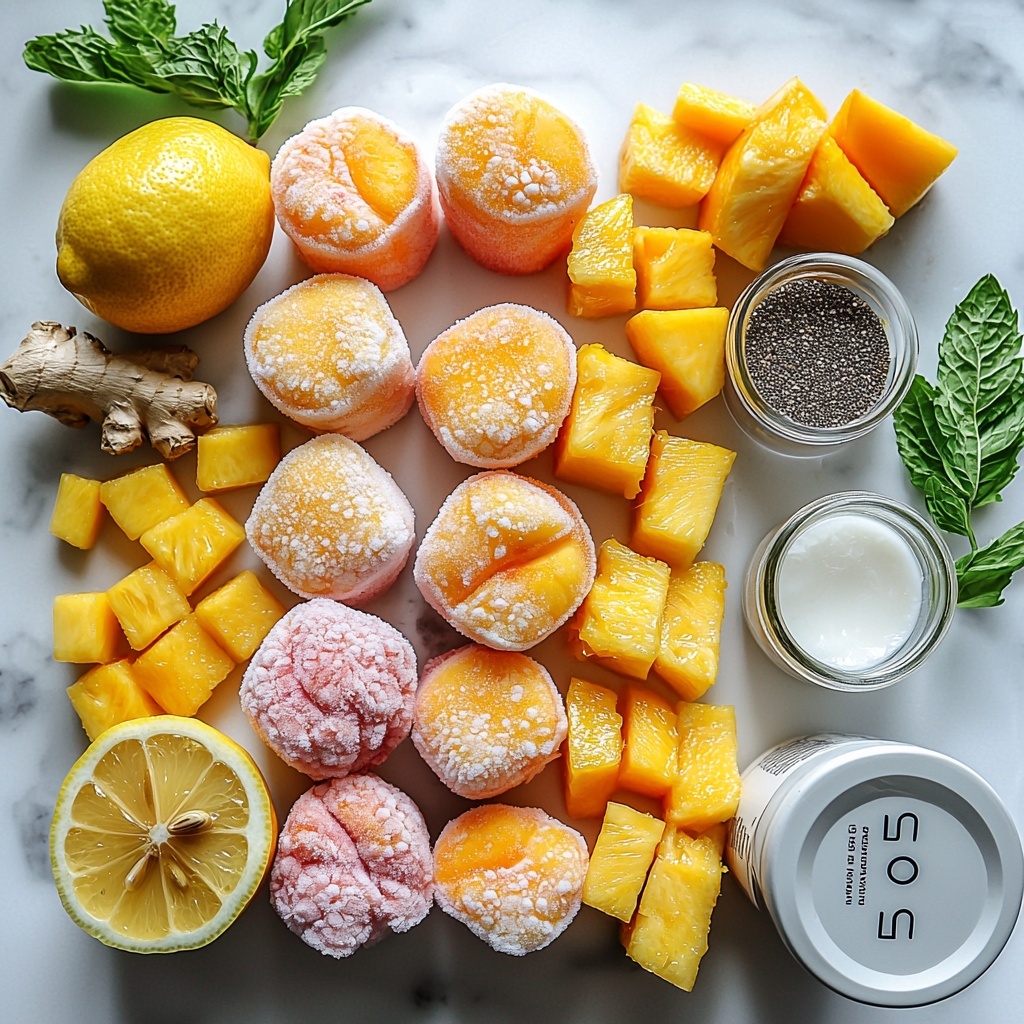 Before blending, make sure you have everything prepped: frozen peaches, pineapple, and mango should be ready to go, along with freshly squeezed lemon juice and grated ginger. Having all ingredients on hand sets you up for an easy, smooth blending process.