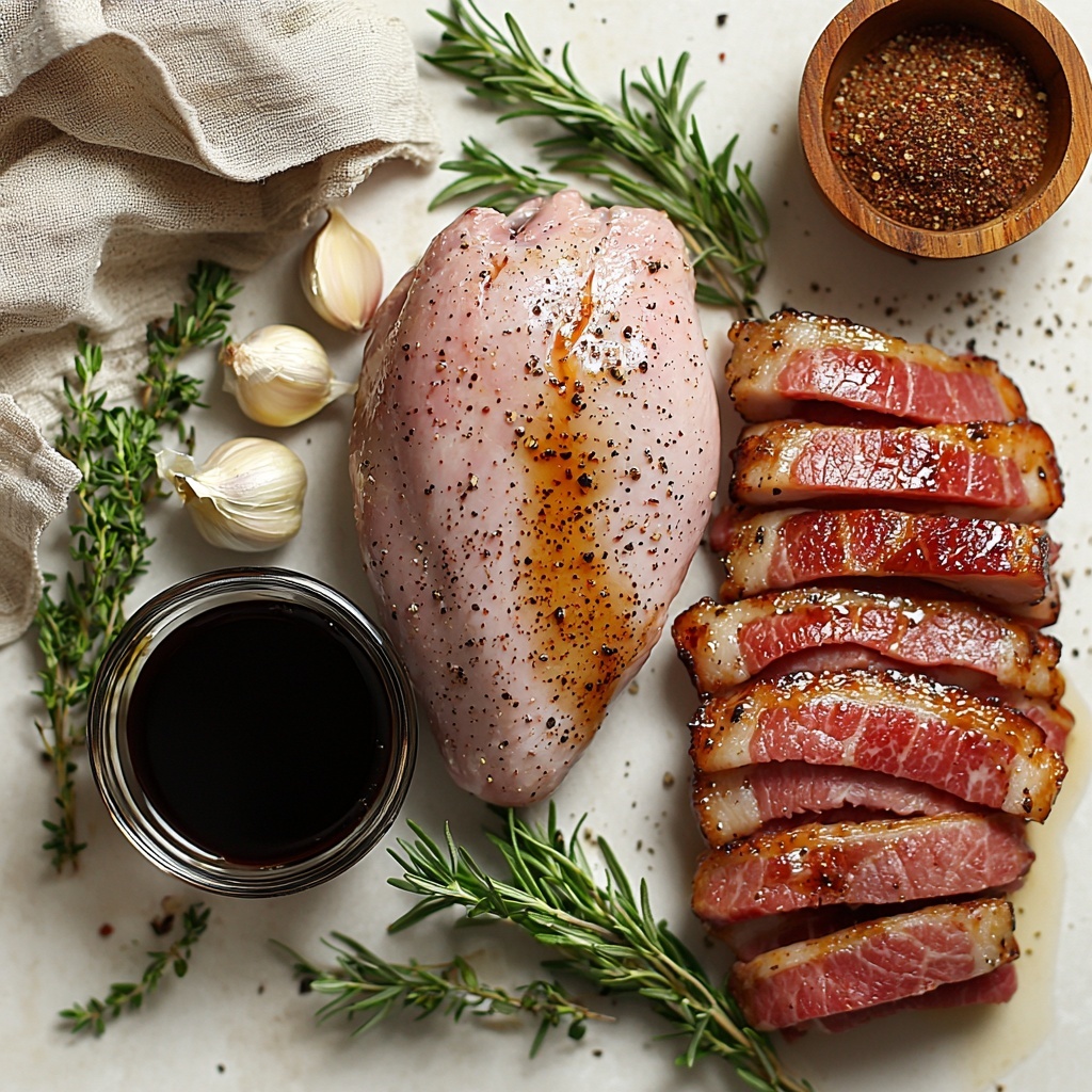 The magic of the Garlic Herb Bacon Wrapped Turkey Breast Recipe starts with a handful of fresh, straightforward ingredients. Each one plays a vital role in building layers of flavor and texture—from the tangy balsamic vinegar that adds depth, to the crisp bacon wrap that creates a beautiful golden crust.